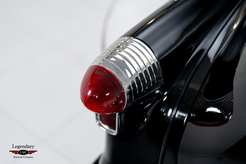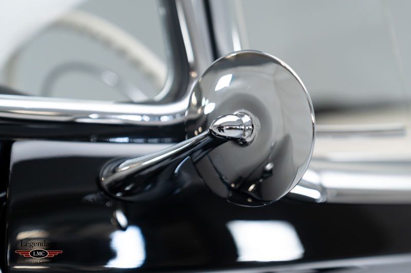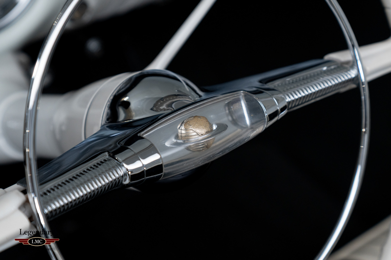 The exterior styling—shared only with its GM dream-car siblings, the Buick Skylark and Cadillac Eldorado—features the distinctive cut-down beltline, flowing rear fenders, unique wraparound windshield, and fully integrated rear wheel openings. The Black finish emphasizes the car’s sculpted proportions, while the White interior highlights the Fiesta’s luxurious, hand-trimmed presentation.