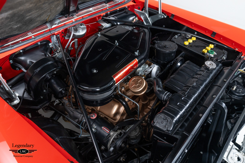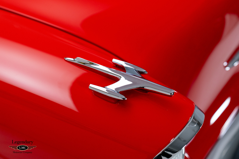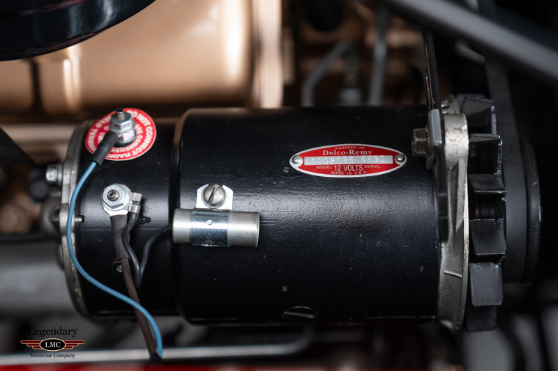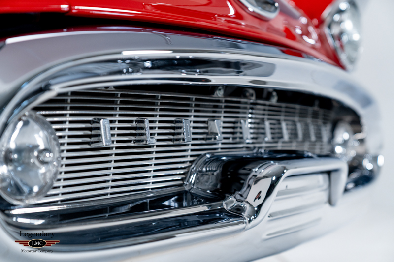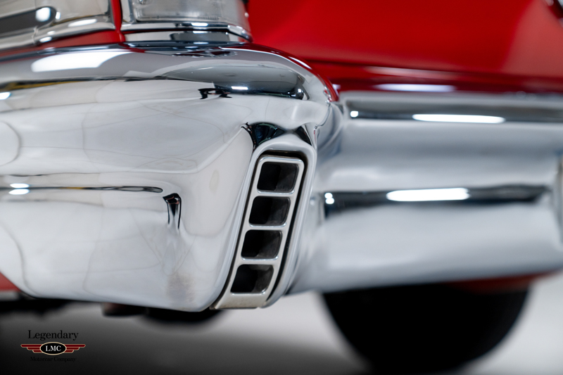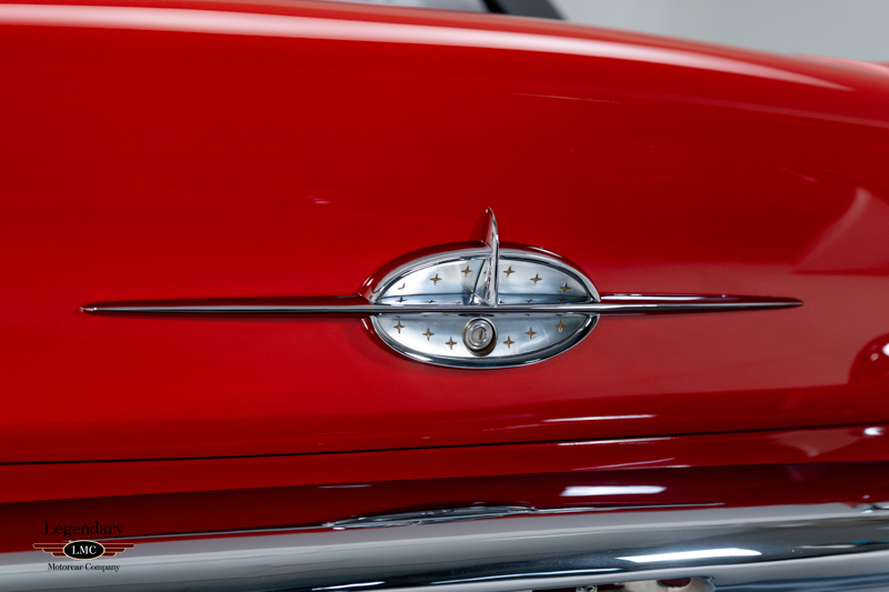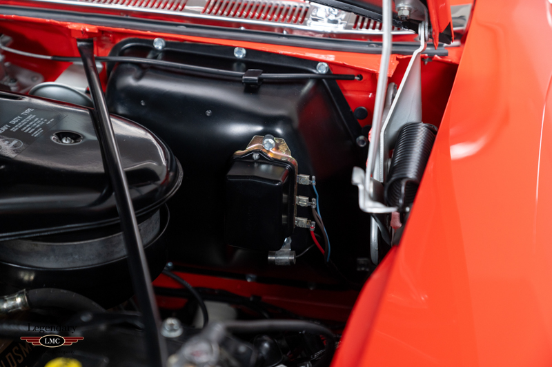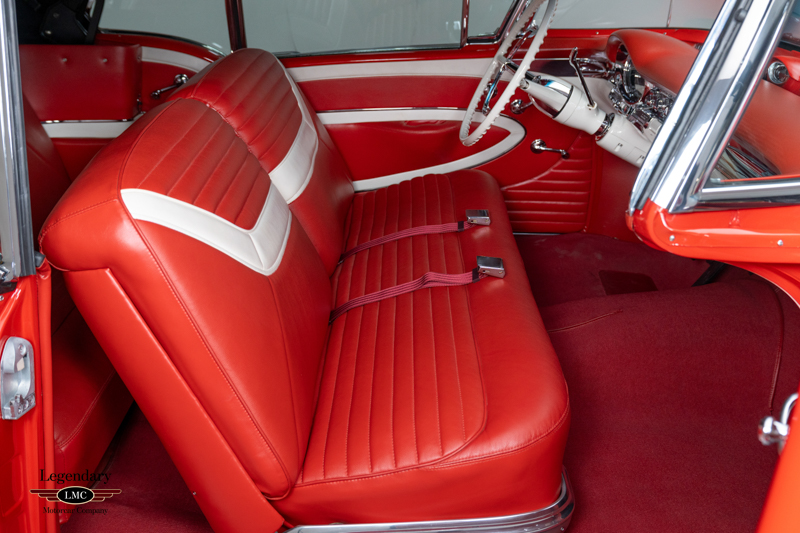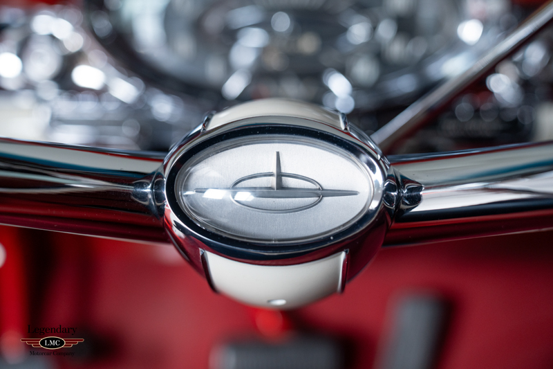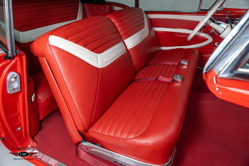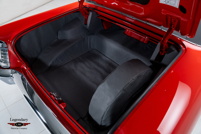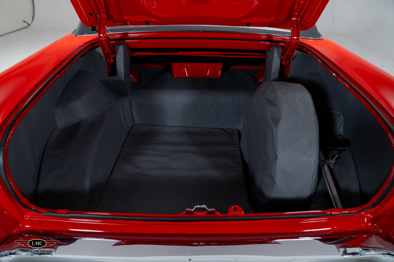 Finished in factory-correct Code 20 Festival Red, the car’s presentation reflects countless hours of preparation and craftsmanship. The paint exhibits remarkable depth and clarity, while the chrome and stainless trim have been expertly replated or polished to a mirror finish. A correct black nylon power top, properly fitted weatherstripping, and fully restored exterior brightwork contribute to a truly show-quality exterior appearance. Many NOS components were sourced to ensure accuracy and authenticity throughout the restoration, further enhancing the car’s pedigree.