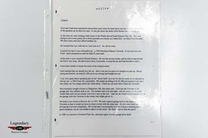 Corvette authorities have praised this car extensively. NCRS legend Roy Sinor, a former owner, described it as “probably the best unrestored/unmassaged Fuelie in existence. Likewise, longtime NCRS head judge Chuck Berge concluded, “The car is totally unrestored and in excellent condition. It is one of the finest examples of an original 1962 Corvette.”