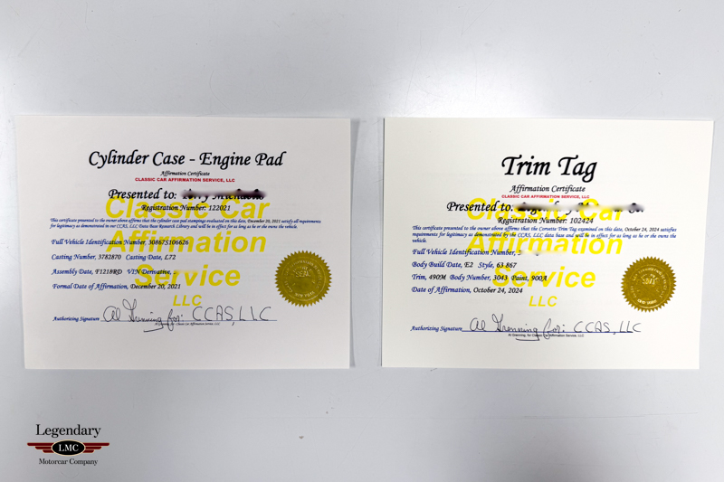 Under the hood sits the numbers-matching 327ci/300hp V8, paired with its numbers-matching four-speed manual transmission, delivering the crisp, engaging performance that made the ’63 Corvette an instant legend. Authenticity and correctness are further validated by both CCAS Cylinder Case Affirmation and CCAS Trim Tag Certification, providing confidence that the car retains its true original identity.