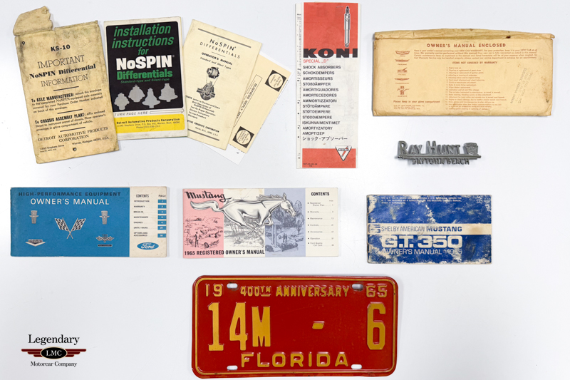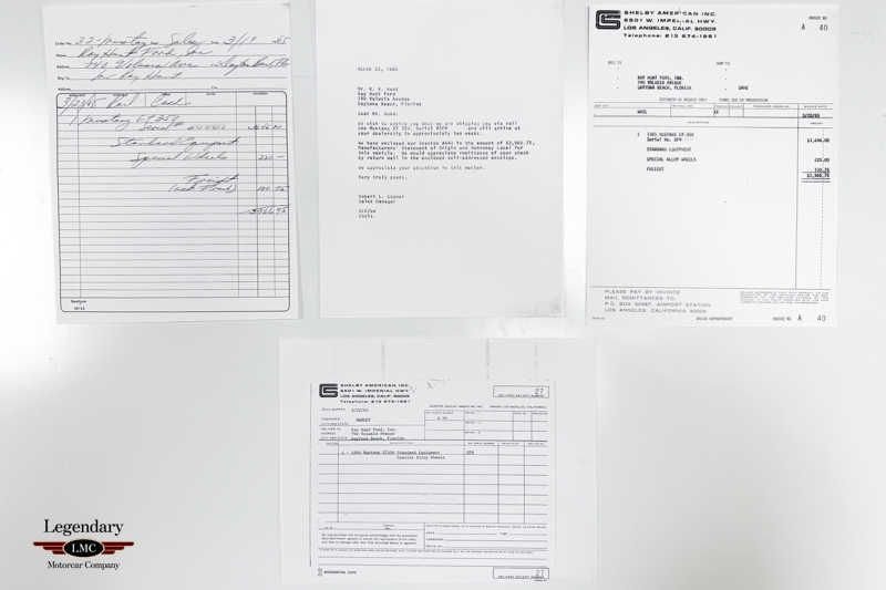 Documented and authenticated, this Shelby is listed in the Shelby Registry. Work at Shelby American was completed on March 17 1965 and delivered new to Ray Hunt Ford in Daytona Beach, Florida. It is accompanied by Shelby American invoices, GT350 Owner Manual, ’65 Mustang Owners Manual, Ford High Performance Manual, No Spin Differentials Operator’s Manual, along with a complete ownership history supported by numerous historical photographs, offering a compelling and well-documented provenance. Both the Shelby and Ford Vin have been authenticated by SAAC.