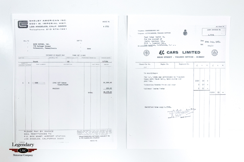 This particular example is one of only 32 factory “narrow hip” 427 Cobras, marking it as an exceedingly rare and historically significant car within the Shelby lineage. Billed to Shelby American on 7/20/1965 and sold through Eger Motors in Mckeesport, PA for a total purchase price of $6,378 to its first owner. The narrow hip 427 Cobra has been regarded by most, as the most desirable body shape, as it retained the elegant, flowing lines of the 289 Cobra while introducing the formidable 427 cubic-inch big-block engine, creating what many consider the most beautiful and balanced configuration of all 427 street Cobras.