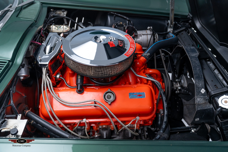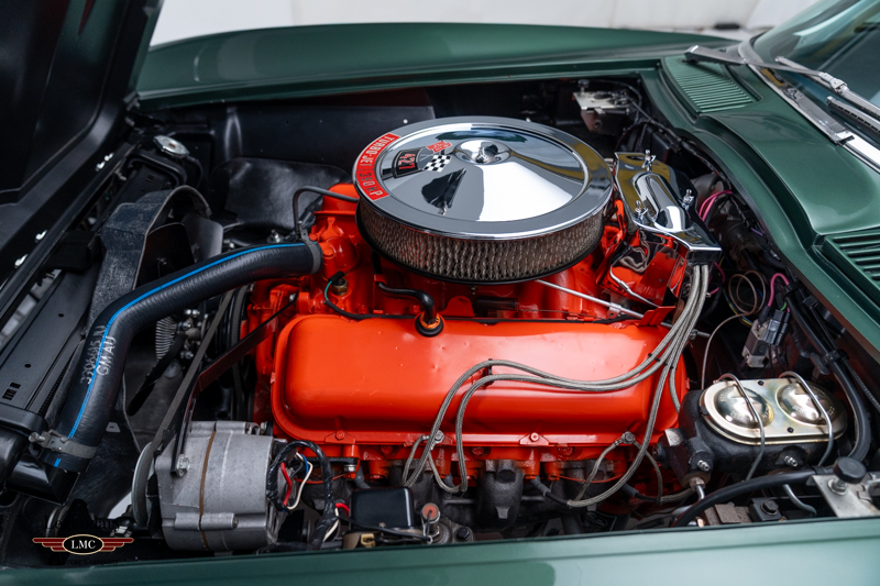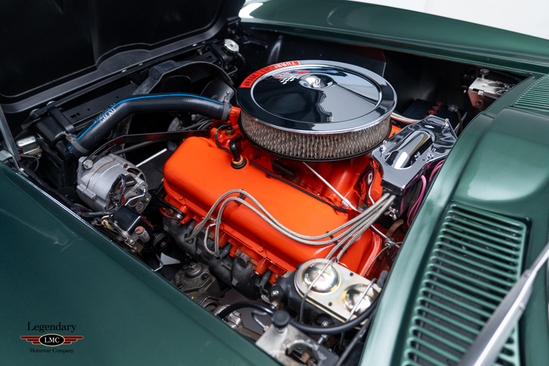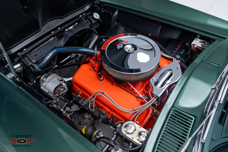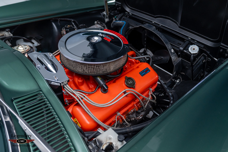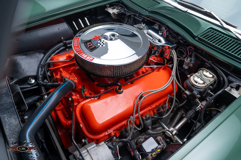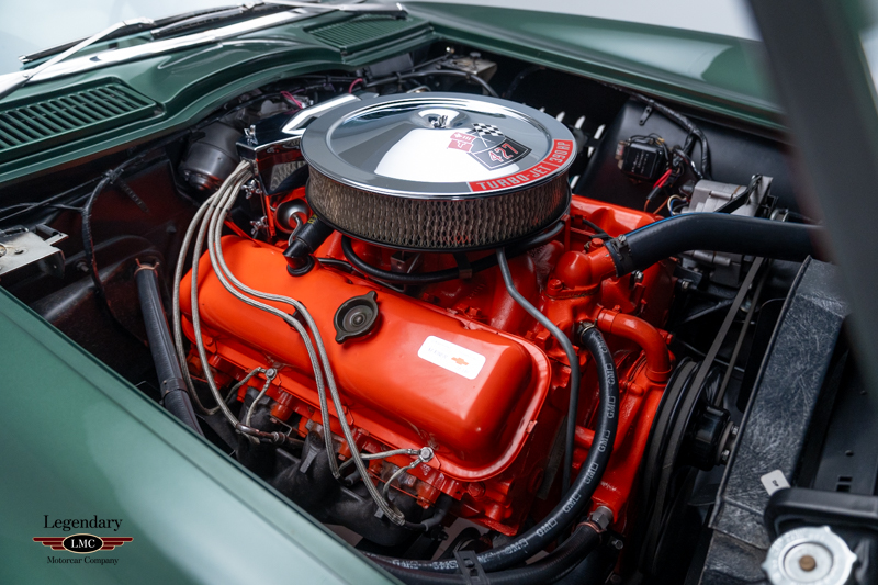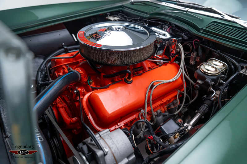 Under the legendary stinger hood lies the matching-numbers L36 427 cubic-inch big-block V8, factory rated at 390 horsepower, paired with its matching-numbers M21 close-ratio four-speed manual transmission. Finished in its factory-correct Goodwood Green (983AA) and accented by a striking white stinger hood, the exterior presents beautifully and authentically. The interior is trimmed in the correct White/Black vinyl (455AC), completing a highly desirable and period-correct color combination.