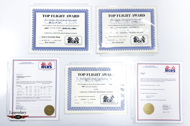 This exceptional Corvette represents a great example of correctness, authenticity, and restoration quality, earning the coveted NCRS National Top Flight Award along with two additional NCRS Chapter Top Flight Awards. A true benchmark example, this car has been painstakingly restored and validated to the highest standards of the National Corvette Restorers Society at the National level in which few cars have achieved.