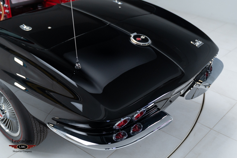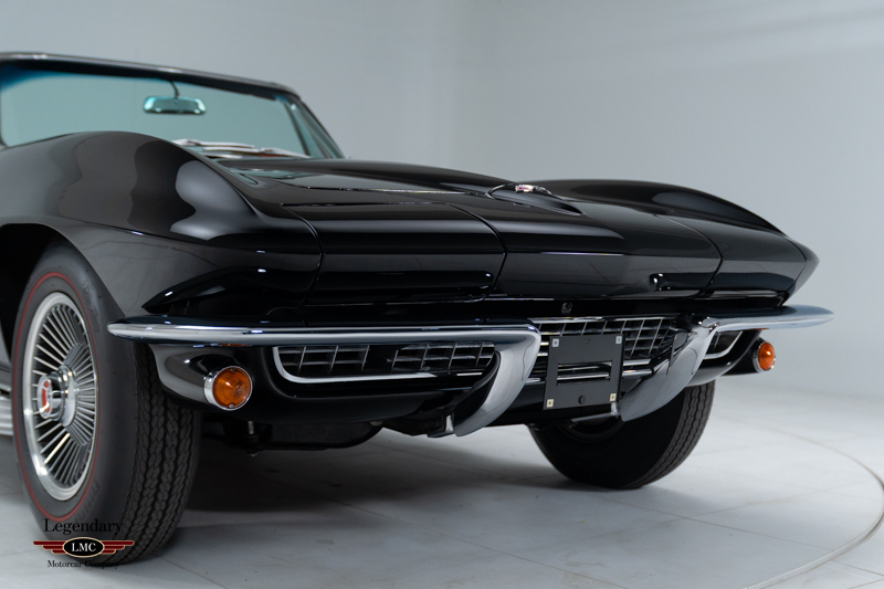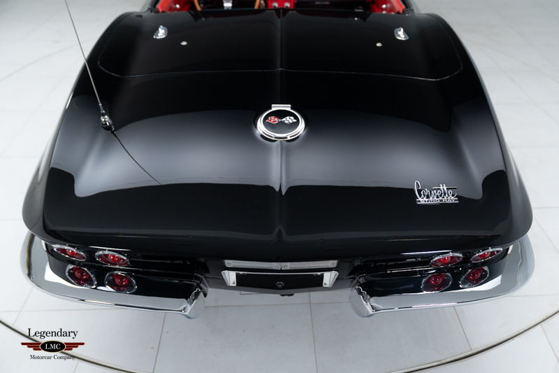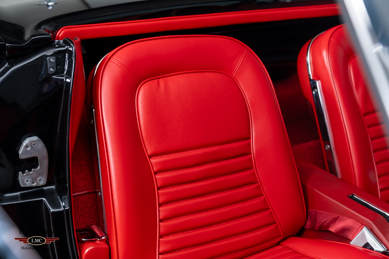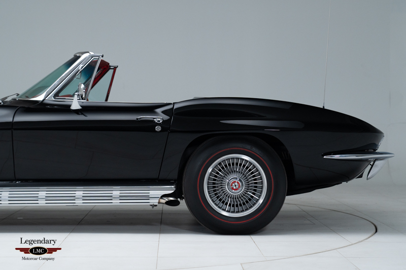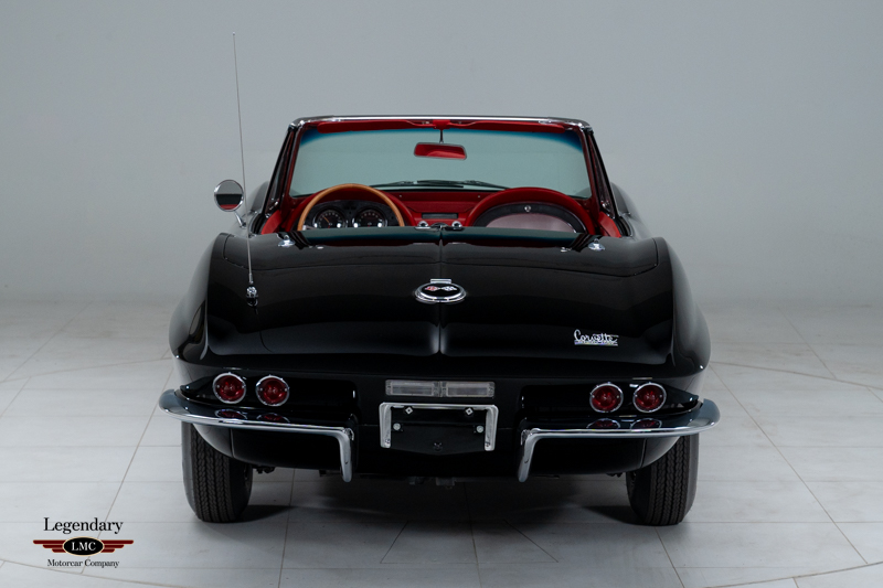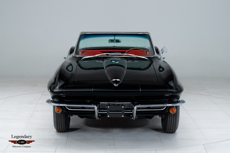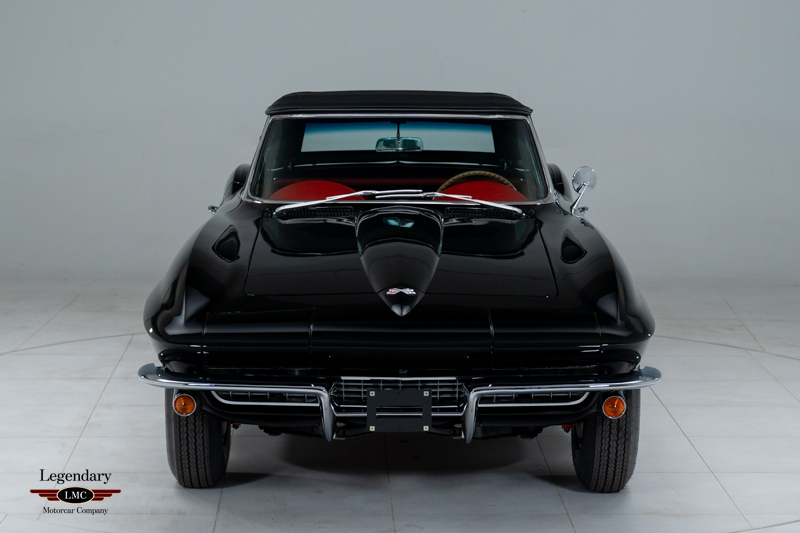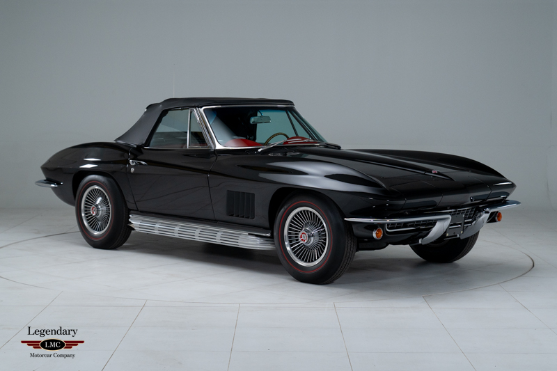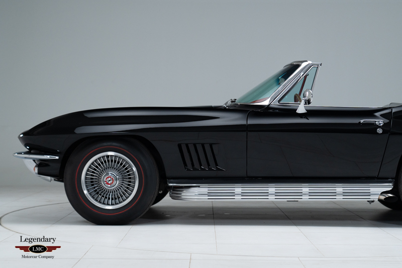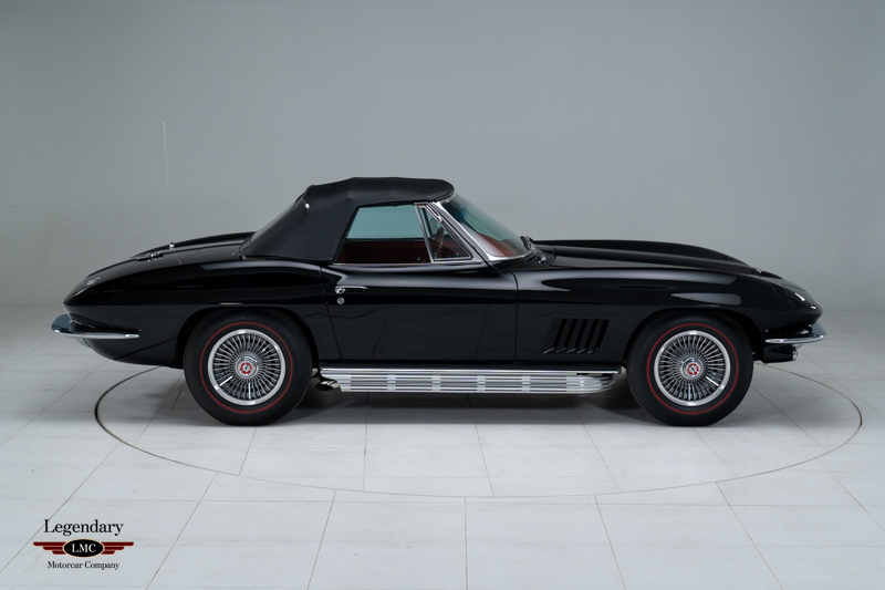 This 1967 Chevrolet Corvette convertible offered here for sale is a highly optioned example stunningly finished in 900 Tuxedo Black with a 400 Red vinyl and has been beautifully frame off restored. Power comes from a matching-numbers L79 engine backed by a matching numbers Muncie four speed manual transmission. This example comes with an incredible list of options including factory style Frigidaire air conditioning, hardtop, side exhaust, power windows, speed minder, power brakes, power steering and AM/FM radio. The underside of the Corvette is nicely finished with a satin Black painted frame, detailed suspension and bare fiberglass floors.