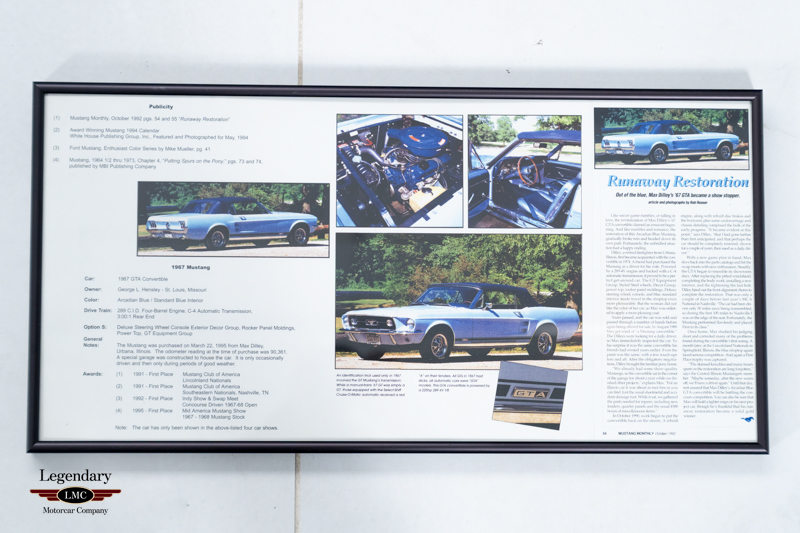 This 1967 Ford Mustang Convertible checks every box for collectors seeking provenance and concours-level presentation. Finished in the elegant shade of Arcadian Blue over Blue vinyl bucket seats, this beautifully executed A-code 289ci Mustang has been restored to an exceptional standard—and confirmed by capturing multiple First Place awards at Mustang Club of America (MCA) National events and the prestigious 2025 AACA National First Prize. Also featured in both Mike Mueller’s Mustang Enthusiast and History books and Mustang Monthly Magazine Feature, as a reference example for great Mustang convertibles. The result is a truly standout Mustang that combines show-winning quality with authentic factory-correct detailing.
