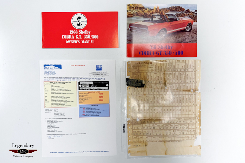 The car is documented with its Marti Report, build sheet, manuals, and more, and is listed in the Shelby Registry, adding further confidence in its authenticity and provenance. A rare KR convertible in an iconic color combination and accompanied by significant documentation, this 1968 Shelby GT500KR represents a standout example of one of Shelby’s most collectable models.