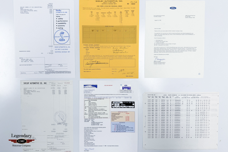 Powered by its legendary 428 Cobra Jet Ram Air engine paired with the factory four-speed close-ratio manual transmission, this GT500 delivers the unmistakable big-block Shelby driving experience. The Marti Report confirms the car was built at Dearborn on January 17, 1969—two days behind schedule—and sold new through Wilmington Sales Inc. Only 48 examples were finished in this paint code, just 34 with this paint and trim combination, and only 243 equipped with the desirable white power top with a glass backlite, making this a particularly rare configuration even within Shelby’s already limited production. When you take all of this into account, it is one of only a few ever produced in this combination.