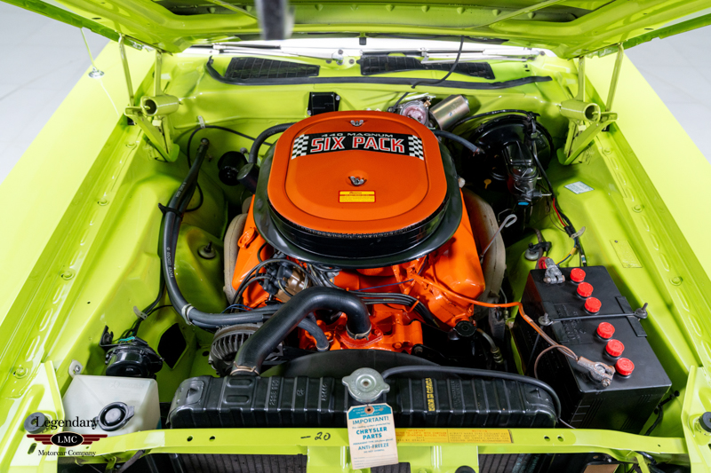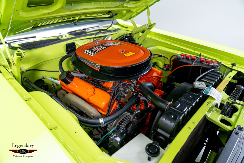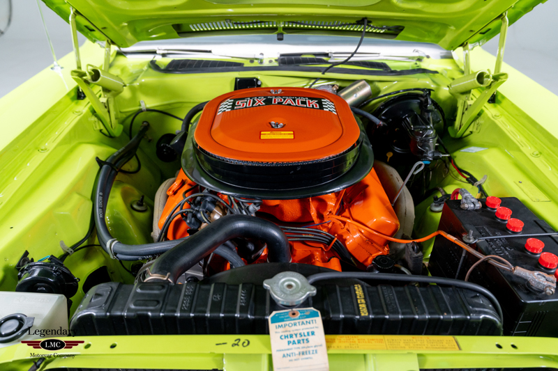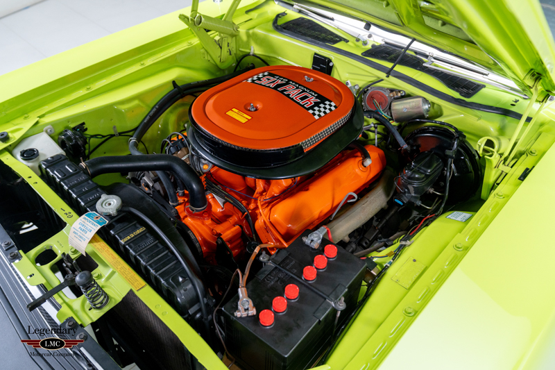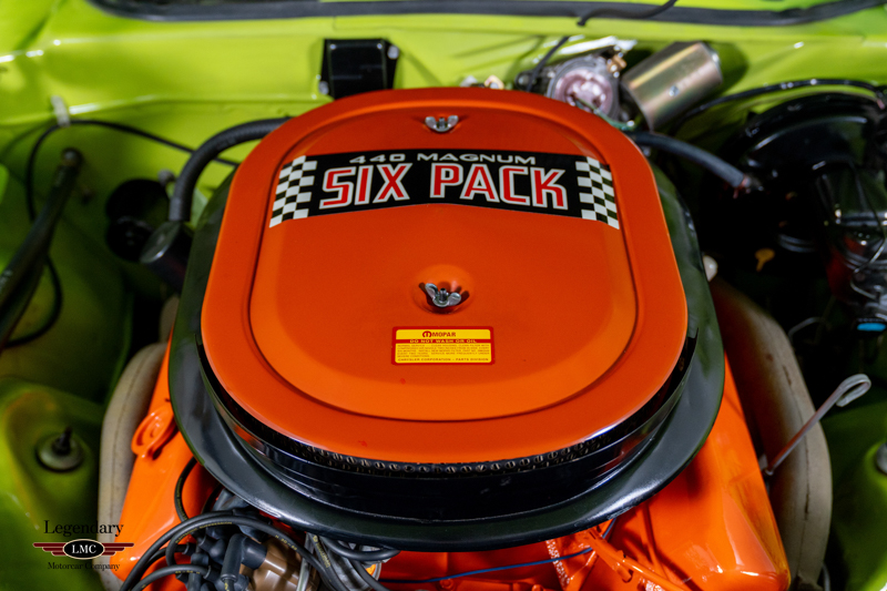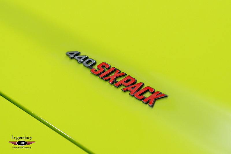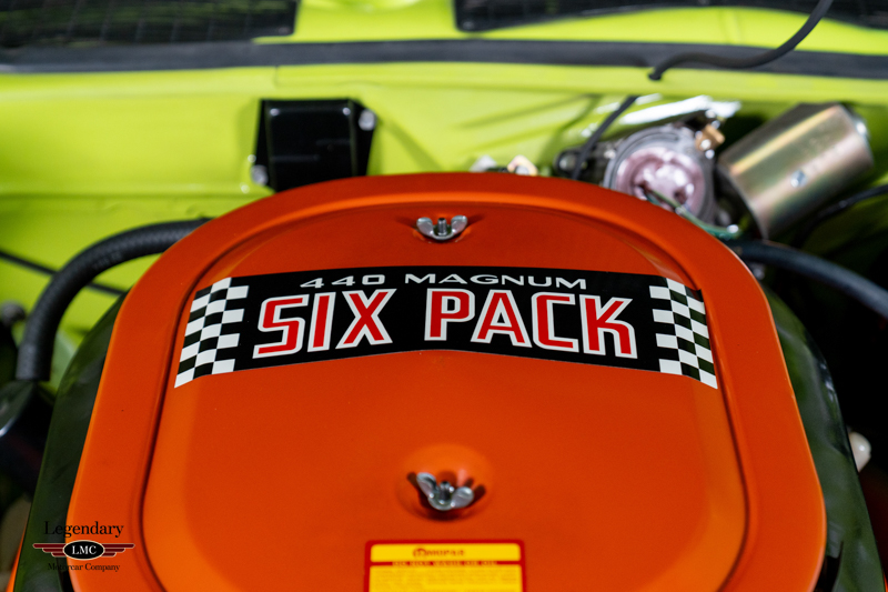 Introduced in 1970, the Dodge Challenger R/T quickly became one of the most formidable performance offerings of the muscle-car era, especially when equipped with the legendary 440 Six Pack engine. Combining bold High Impact colors, aggressive styling, and Chrysler’s top big-block performance technology, the Six Pack R/T delivered exceptional straight-line performance and a commanding road presence. This example captures that legacy perfectly, having been rotisserie restored to factory-correct standards in its original Sublime Green with Black vinyl roof and Black Bumblebee stripe.
