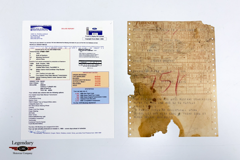 Further supporting its provenance, this Boss 429 is well documented, accompanied by a Marti Report as well as two original factory build sheets, providing clear verification of its factory specifications and production details.