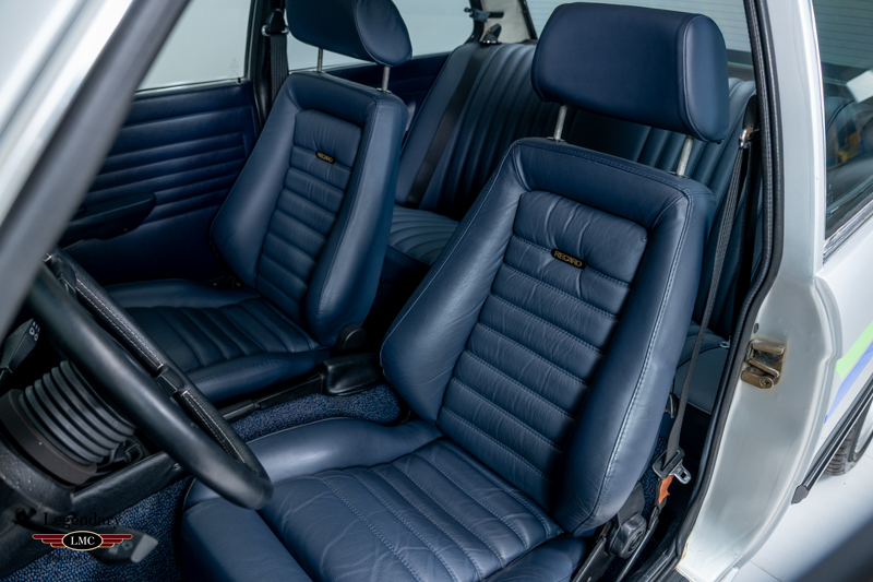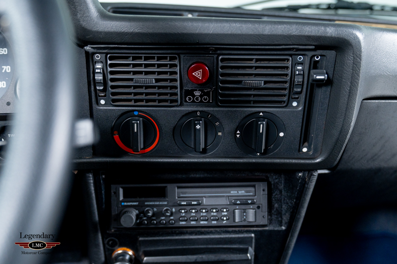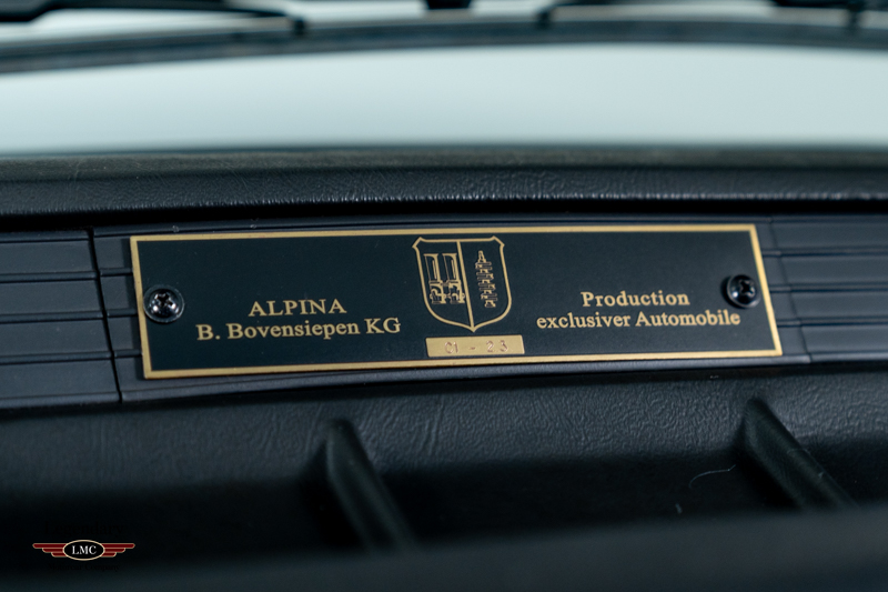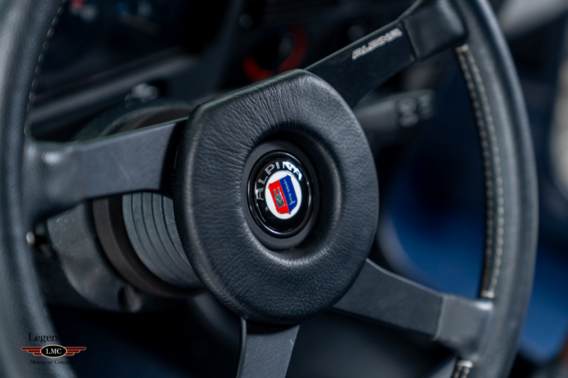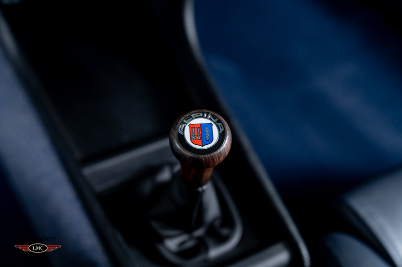 Inside, the C1 continues the Alpina ethos with a stunning blue leather interior highlighted by optional Recaro bucket seats, an Alpina steering wheel, wooden shift knob, unique instrumentation, and the all-important Alpina production plaque. Period-correct Alpina 15-inch multi-spoke alloy wheels with black centres complete the car’s distinctive look.