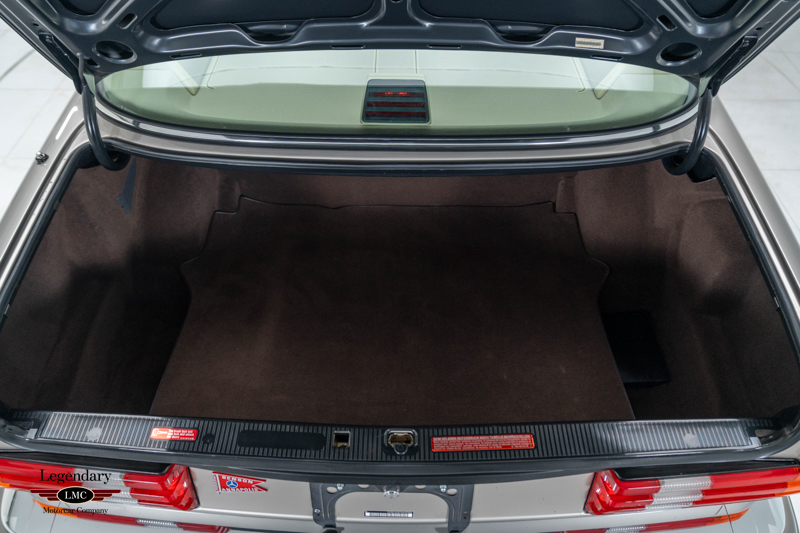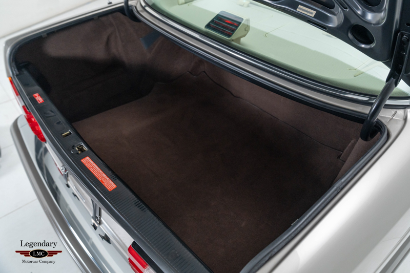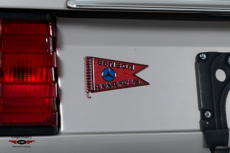 The exterior retains its understated, formal presence, highlighted by Smoke Silver Metallic paint with contrasting darker lower cladding. Design details include bright chrome window and bumper trim, a power-operated sunroof, a power antenna, dual exhaust outlets, and correct 14″ Bundt alloy wheels. The fit and finish throughout reflect the exceptional build quality that defined Mercedes-Benz’s flagship sedans of the era, with close-up photography in the gallery illustrating the car’s well-preserved condition.