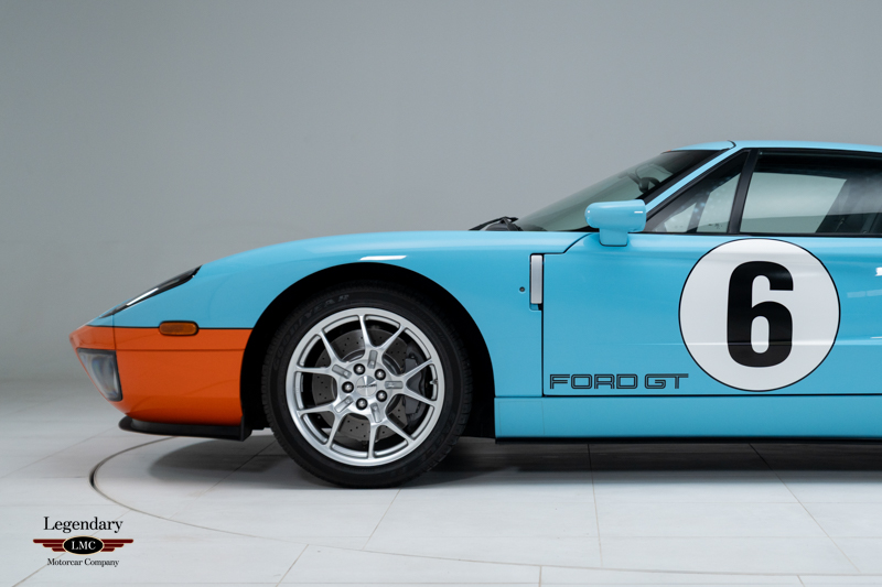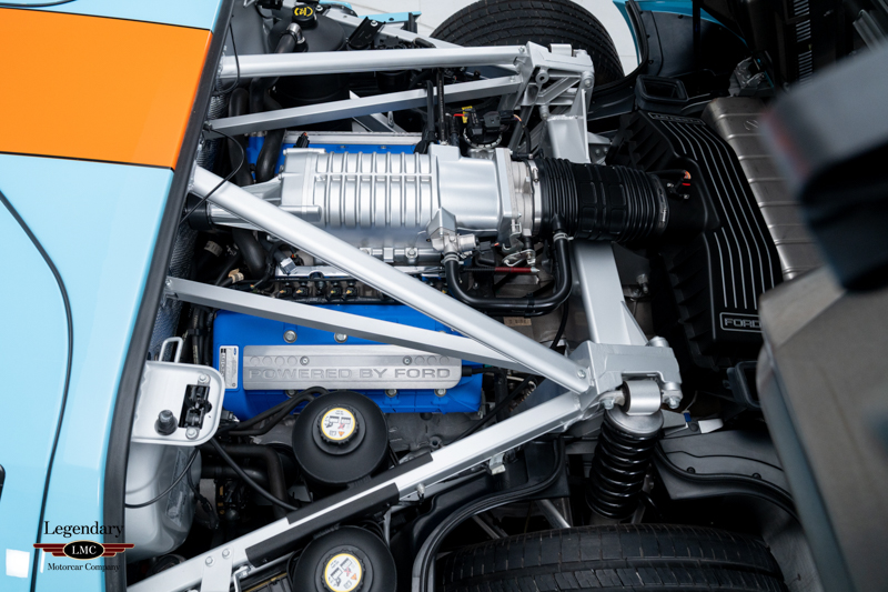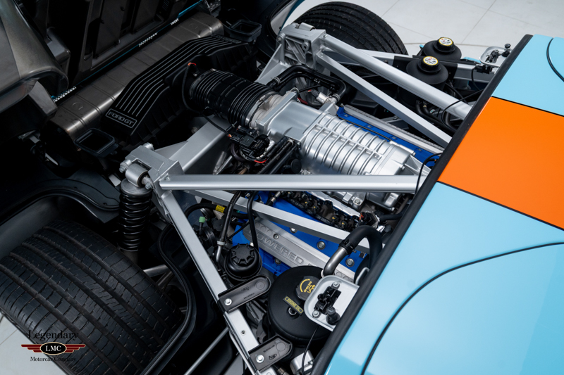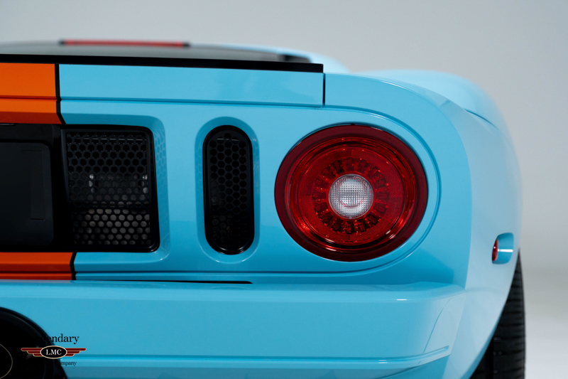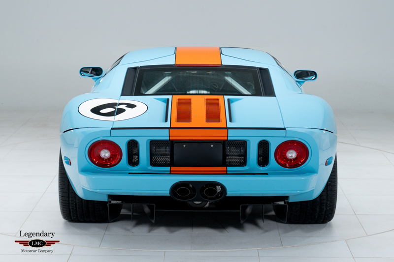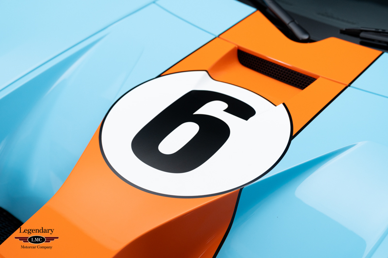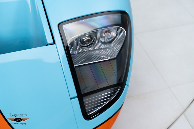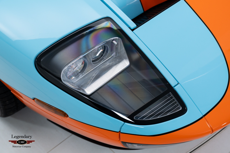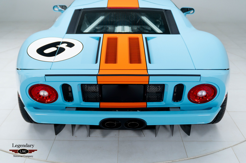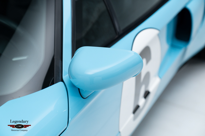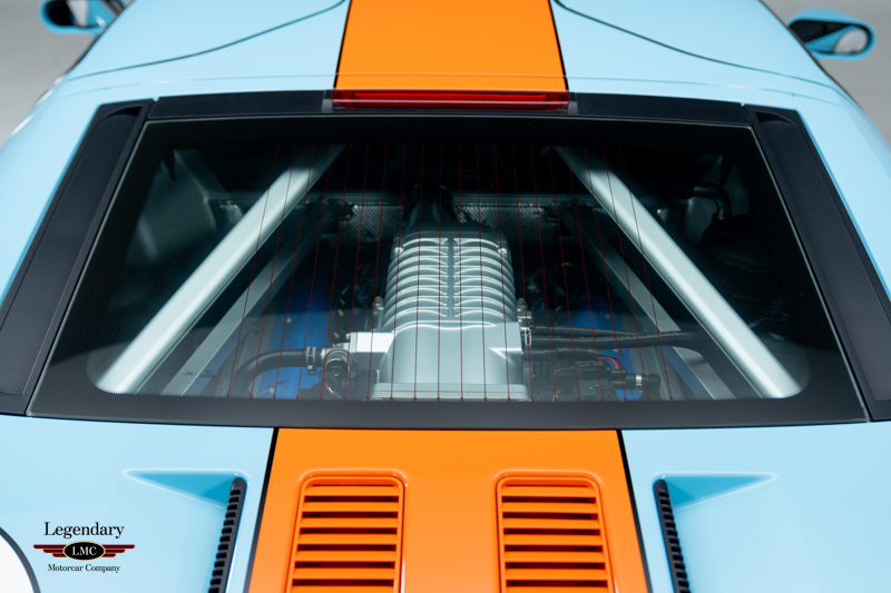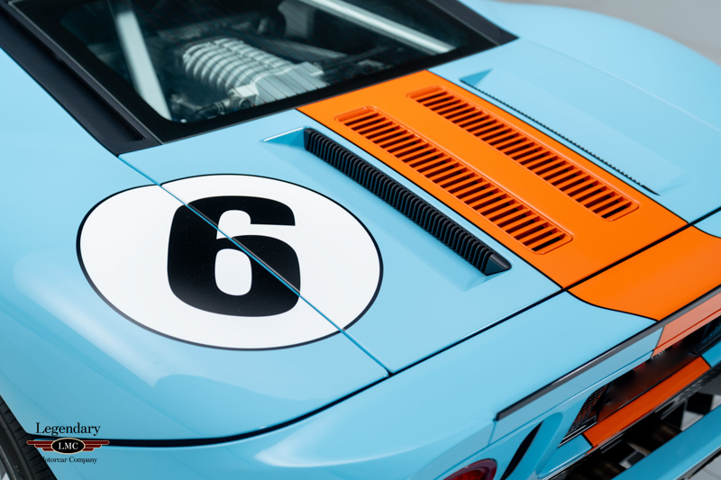 Finished in the iconic Heritage livery inspired by the Gulf Racing GT40s, this example captures the essence of Ford’s motorsport glory. The instantly recognizable color scheme pays direct tribute to the machines that conquered Le Mans, making this variant one of the most visually and historically significant iterations of the Ford GT.