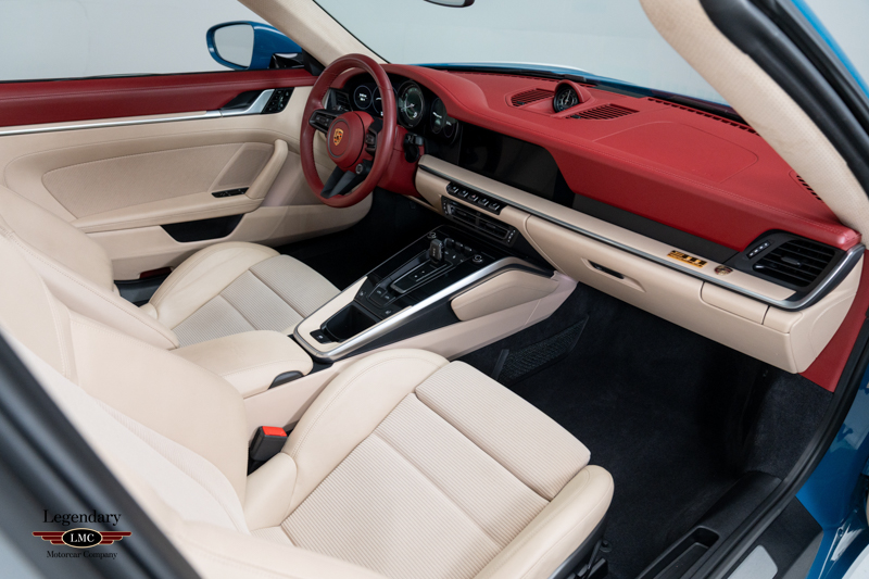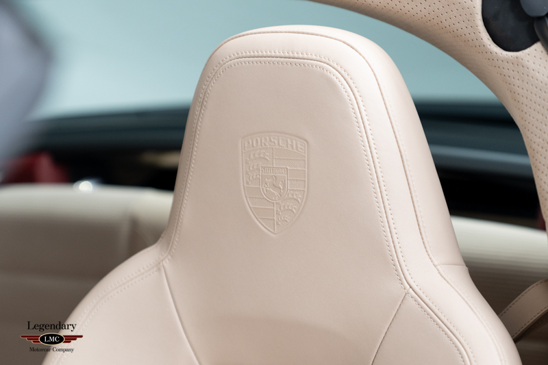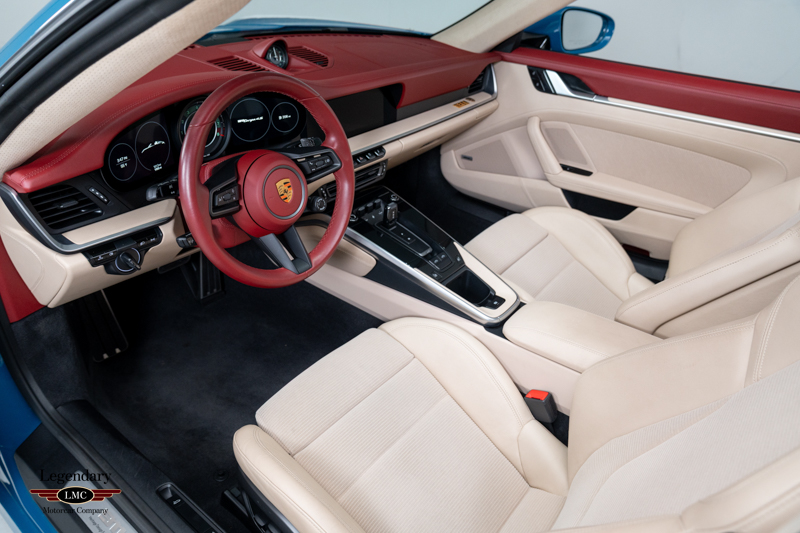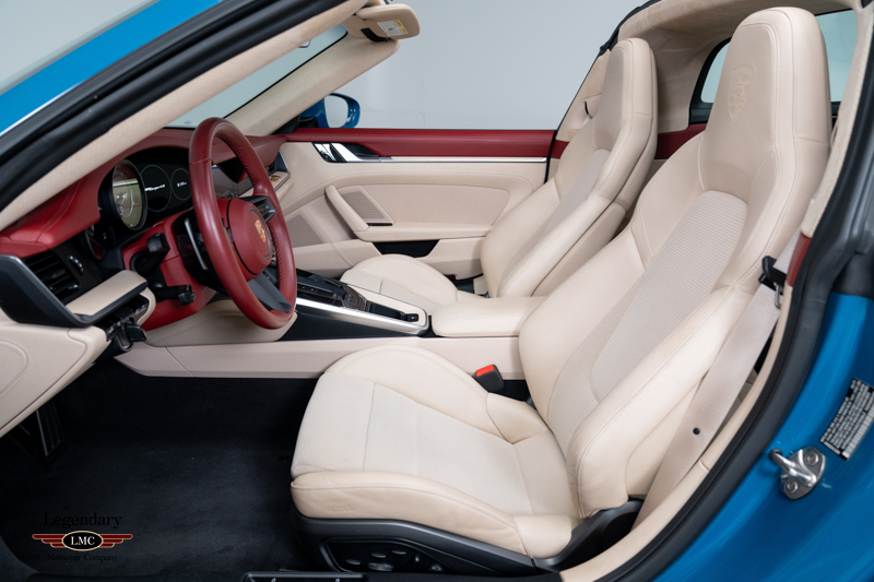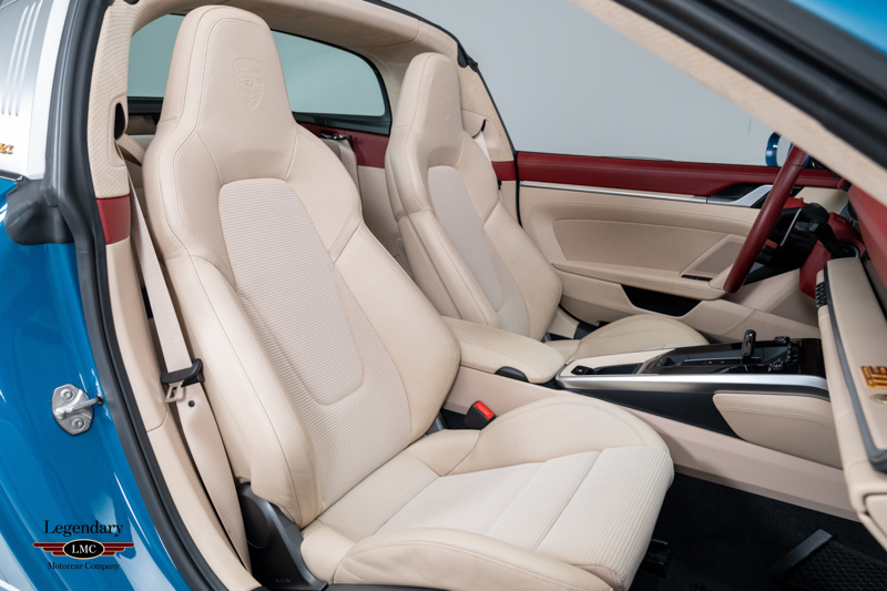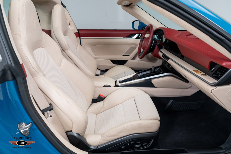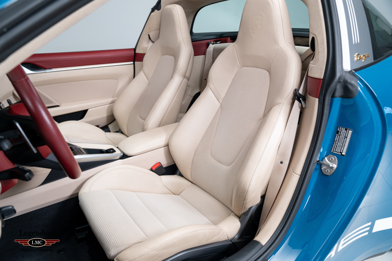 This particular 911 Targa 4S Heritage Design Edition, limitation number 625, is likely among the more custom examples of Heritage Editions to emerge from the Porsche Exclusive Manufaktur workshops. The original owner was not only fortunate enough to secure a Heritage Design allocation but a coveted Paint to Sample (PTS) slot with Porsche noting that the PTS program special requests are integral to satisfying the individual demands that are the core of Porsche. It is finished in the rarely seen historical PTS color of Oslo Blue that harkens back to the 356 B-era of 1962 and 1963. The shade suits the historical nature of the model with aplomb. Porsche describes the interior, here selected in two-tone Bordeaux Red/Atacama Beige OLEA club leather as “Expressive and harmonious and above all timeless.” Furthermore, corduroy fabric makes a return to the interior of the 911, used on the door panels and the seat centers.