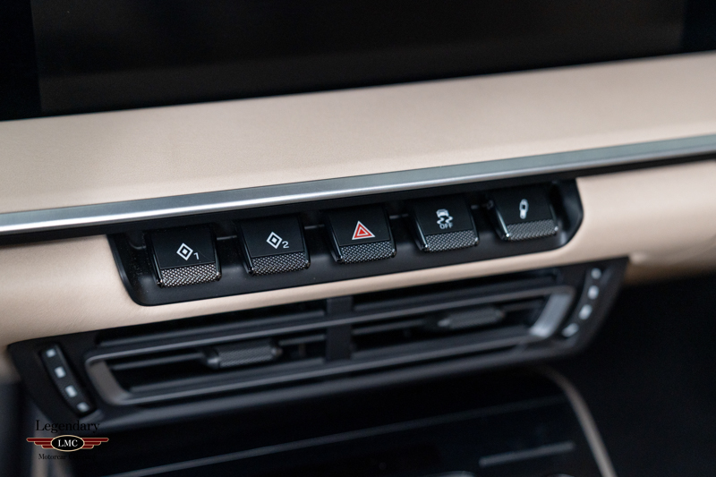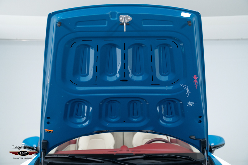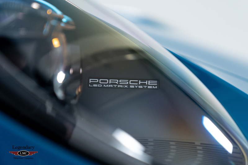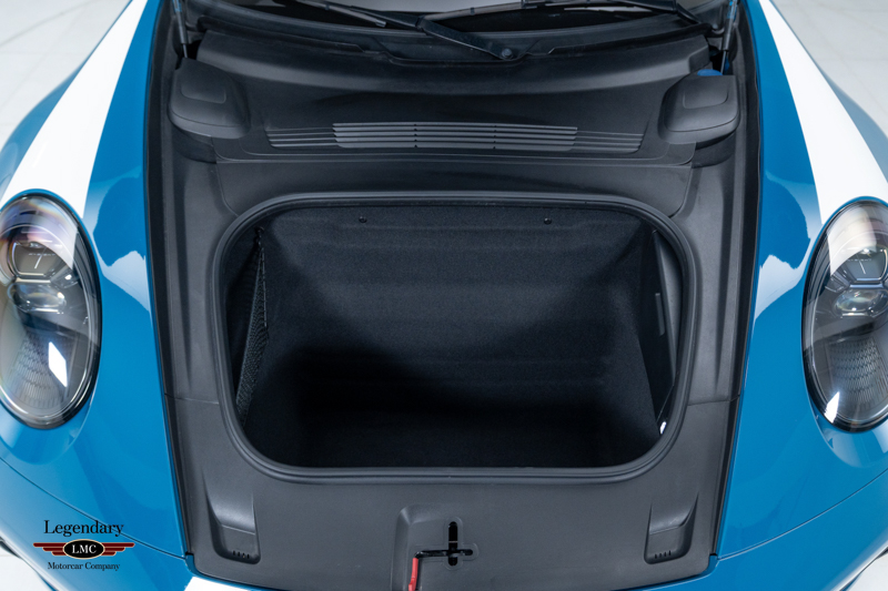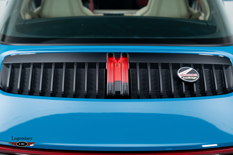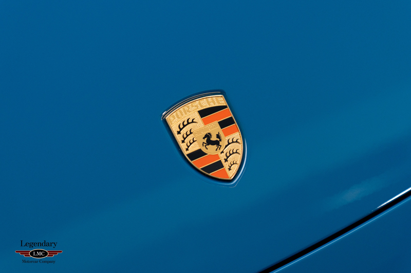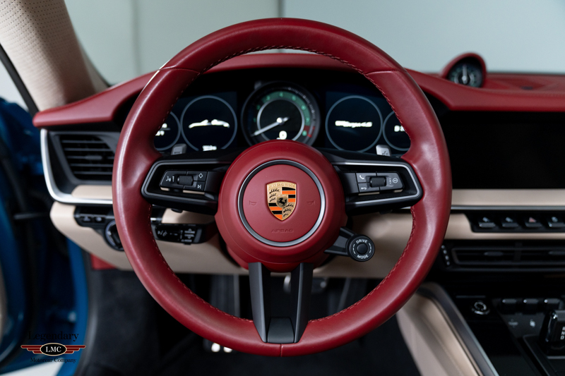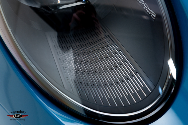 This particular 911 Targa 4S Heritage Design Edition, limitation number 625, is likely among the more custom examples of Heritage Editions to emerge from the Porsche Exclusive Manufaktur workshops. The original owner was not only fortunate enough to secure a Heritage Design allocation but a coveted Paint to Sample (PTS) slot with Porsche noting that the PTS program special requests are integral to satisfying the individual demands that are the core of Porsche. It is finished in the rarely seen historical PTS color of Oslo Blue that harkens back to the 356 B-era of 1962 and 1963. The shade suits the historical nature of the model with aplomb. Porsche describes the interior, here selected in two-tone Bordeaux Red/Atacama Beige OLEA club leather as “Expressive and harmonious and above all timeless.” Furthermore, corduroy fabric makes a return to the interior of the 911, used on the door panels and the seat centers.