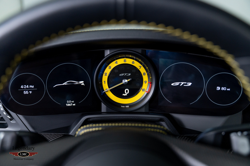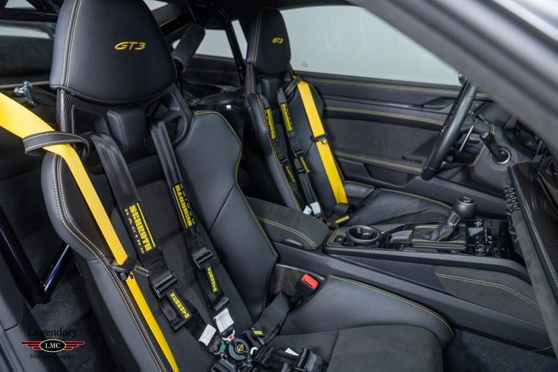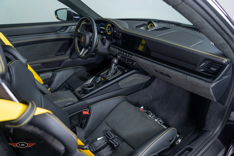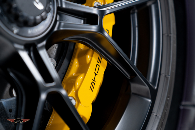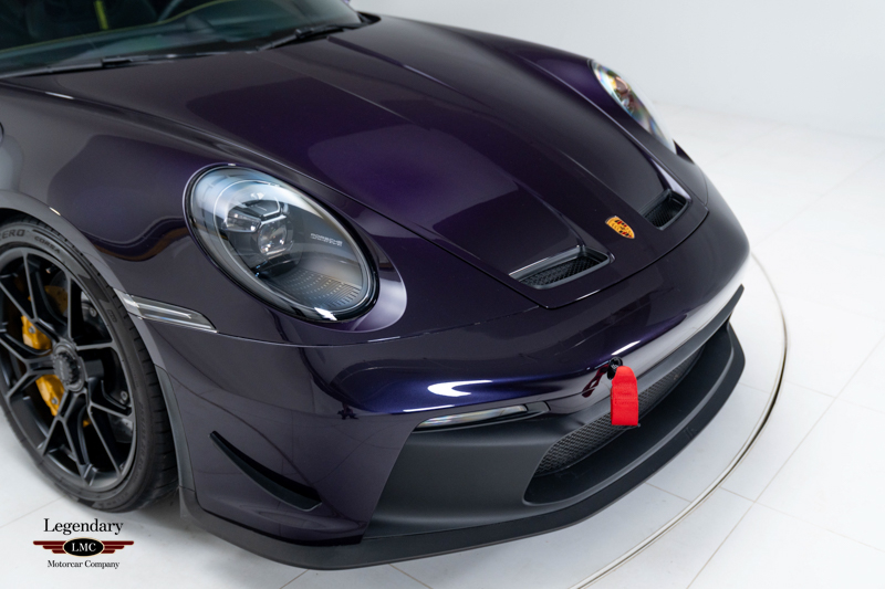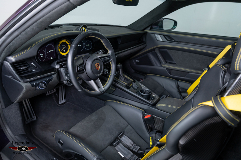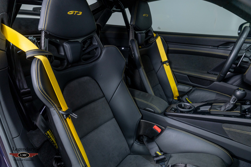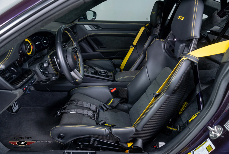 Completed on 9 December 2021, chassis number 69359 was specified in Paint to Sample Viola Metallic with a matching roof, paired with a Black Leather/Race-Tex interior stitched in GT Silver. The exterior color scheme was complemented by contrasting Deviated Stitching Interior Package and a suite of deviated-stitching Z-options, while Racing Yellow seat belts, central tachometer, and Sport Chrono stopwatch dial added further color accents. The GT3's exterior was sharpened by satin Black wheels, carbon-fiber mirror upper trims, and Exclusive Design taillights, with high-gloss carbon-fiber trim inlays and door-sill guards continuing the theme inside.