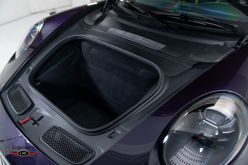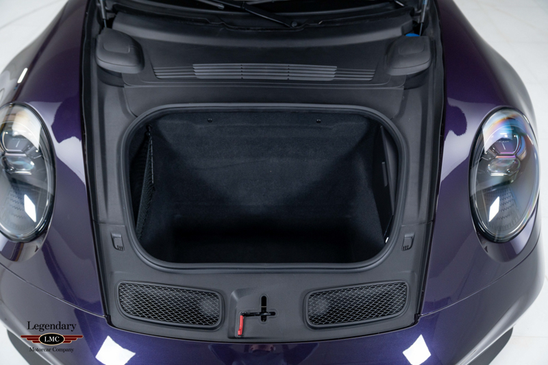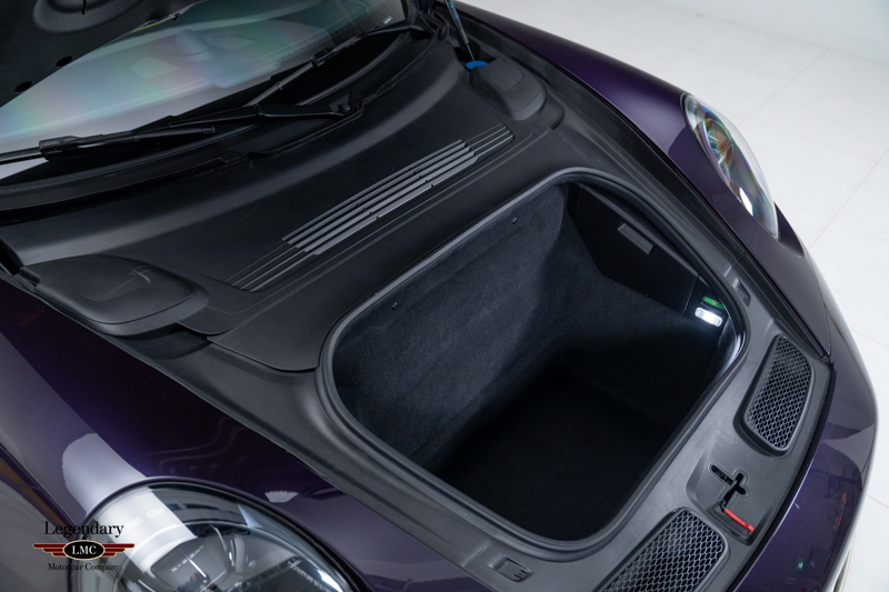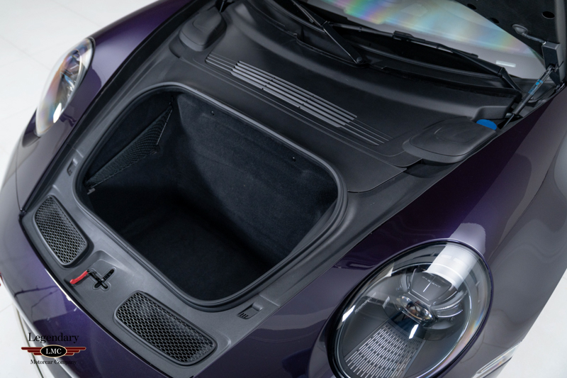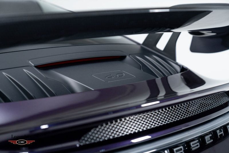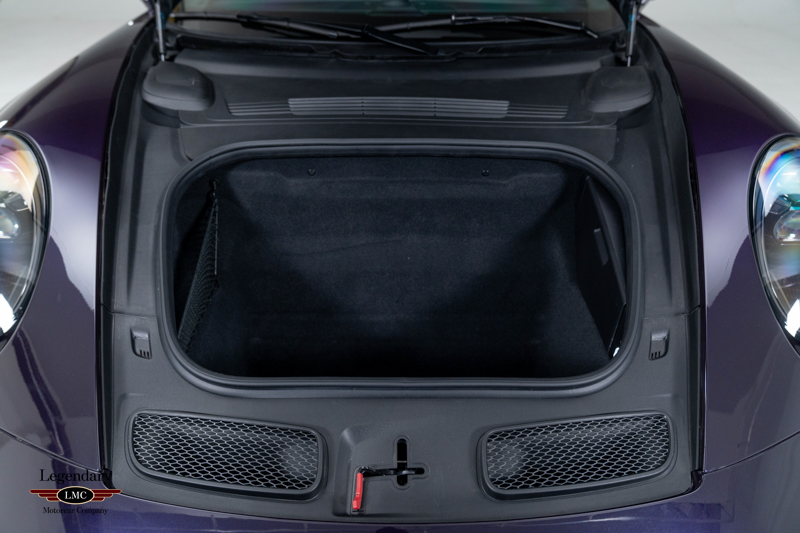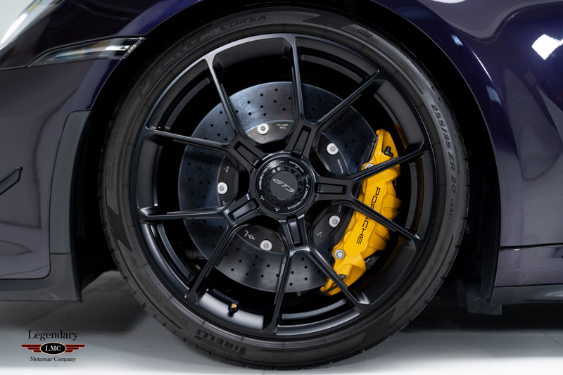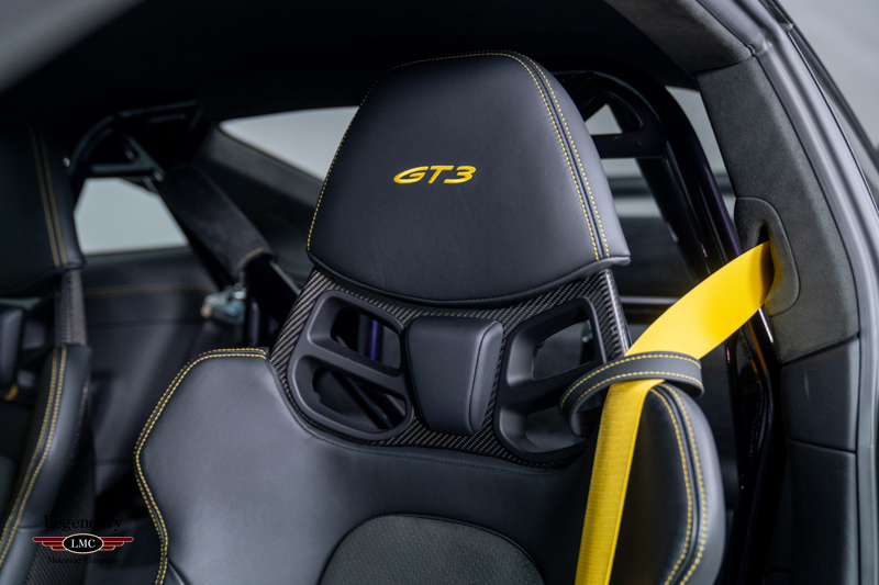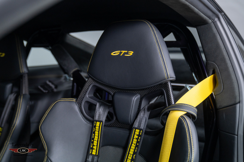 Completed on 9 December 2021, chassis number 69359 was specified in Paint to Sample Viola Metallic with a matching roof, paired with a Black Leather/Race-Tex interior stitched in GT Silver. The exterior color scheme was complemented by contrasting Deviated Stitching Interior Package and a suite of deviated-stitching Z-options, while Racing Yellow seat belts, central tachometer, and Sport Chrono stopwatch dial added further color accents. The GT3's exterior was sharpened by satin Black wheels, carbon-fiber mirror upper trims, and Exclusive Design taillights, with high-gloss carbon-fiber trim inlays and door-sill guards continuing the theme inside.