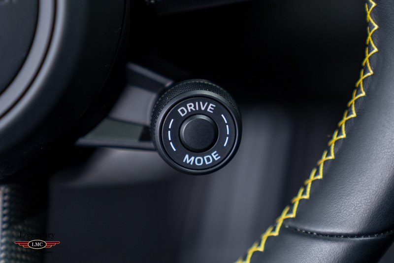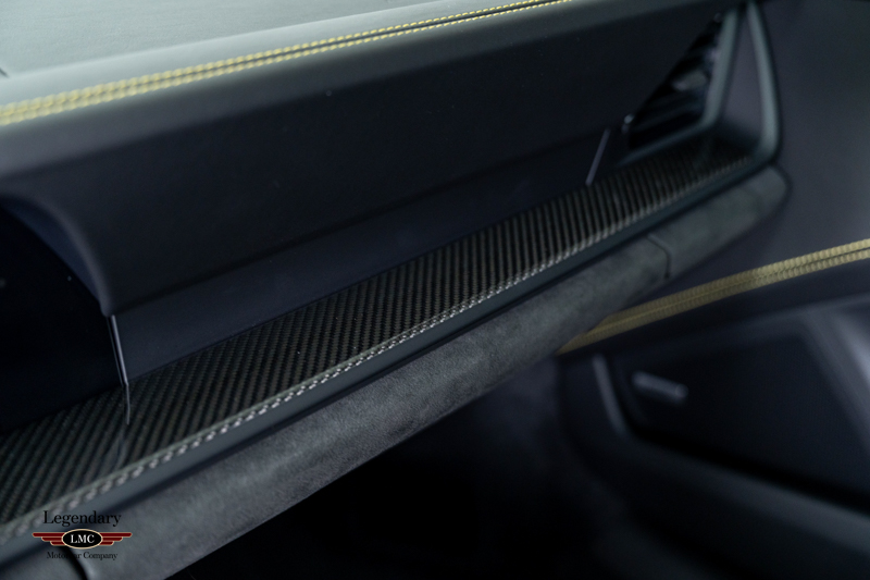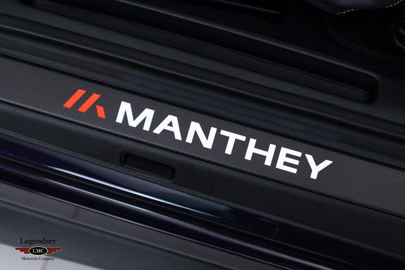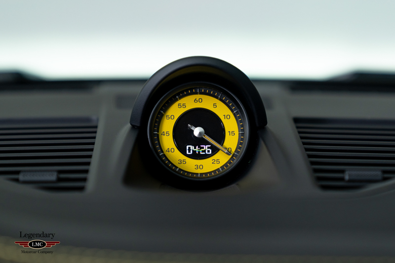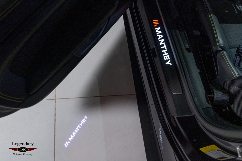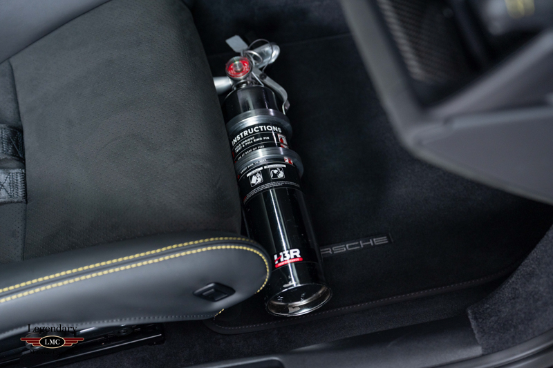 Equipped on this example, the kit encompasses a new four-way adjustable suspension, Manthey OM-1 lightweight wheels with detachable aerodiscs, and a brake upgrade featuring braided brake lines and upgraded brake pads, complemented by an aerodynamic package comprising a revised front splitter/lip, front flics, a new rear diffuser, and a carbon-fiber rear wing with Manthey side plates. Safety enhancements include a Manthey paint-matched roll bar with Schroth five-point harnesses and a Manthey fire extinguisher. Notably, the Manthey upgrades do not compromise the factory warranty, which remains valid on this example until 15 February 2028.