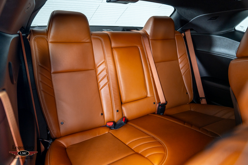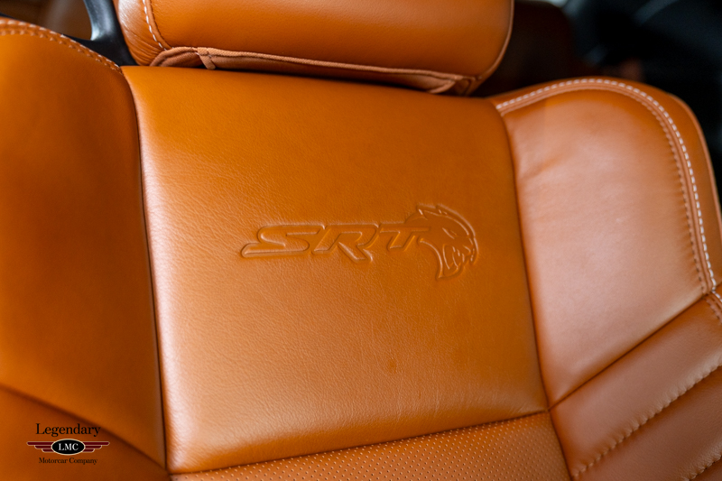 This example was ordered as a Jailbreak package ($15,600 option), unlocking exclusive personalization, high-performance features, and appearance upgrades. Highlights include Laguna leather seats with SRT Hellcat logo in Sepia, suede headliner, premium-stitched dash and door panels, plus a Harman Kardon® 18-speaker premium audio system with trunk-mounted subwoofer. Additional options include the Black Hood package, Red SRT seat belts, power sunroof, and technology package with adaptive cruise control and forward collision warning.