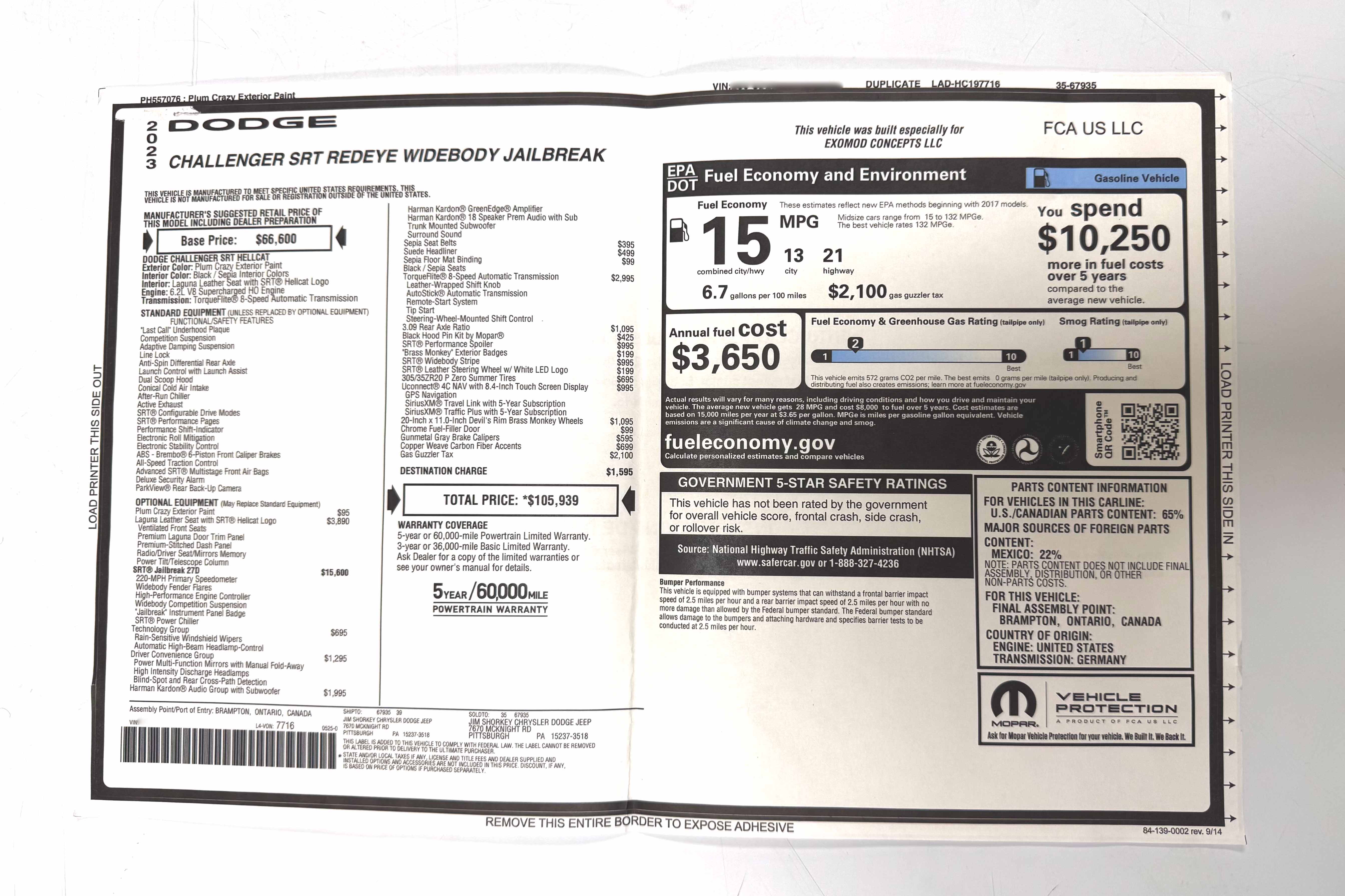 LMC is very proud to offer for sale this 2023 Dodge Challenger SRT Redeye Widebody Jailbreak