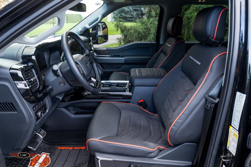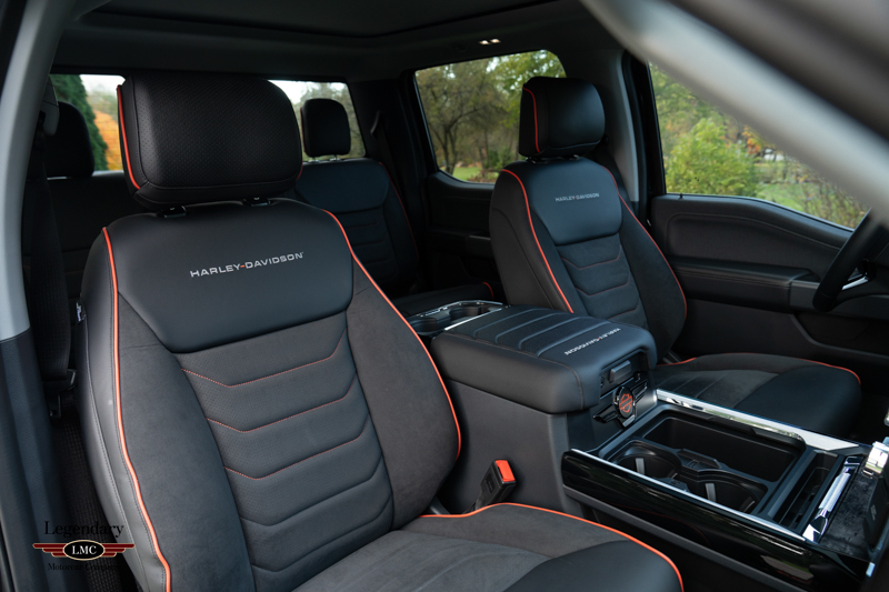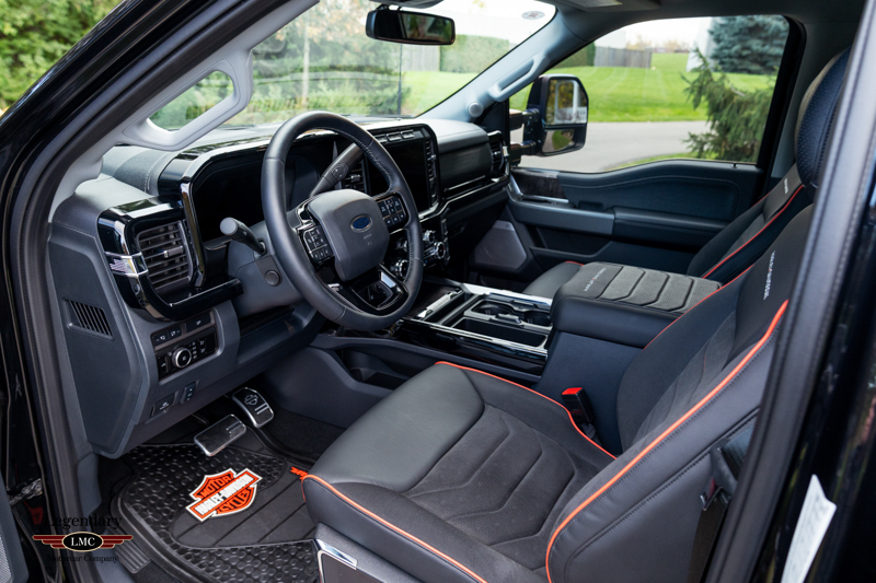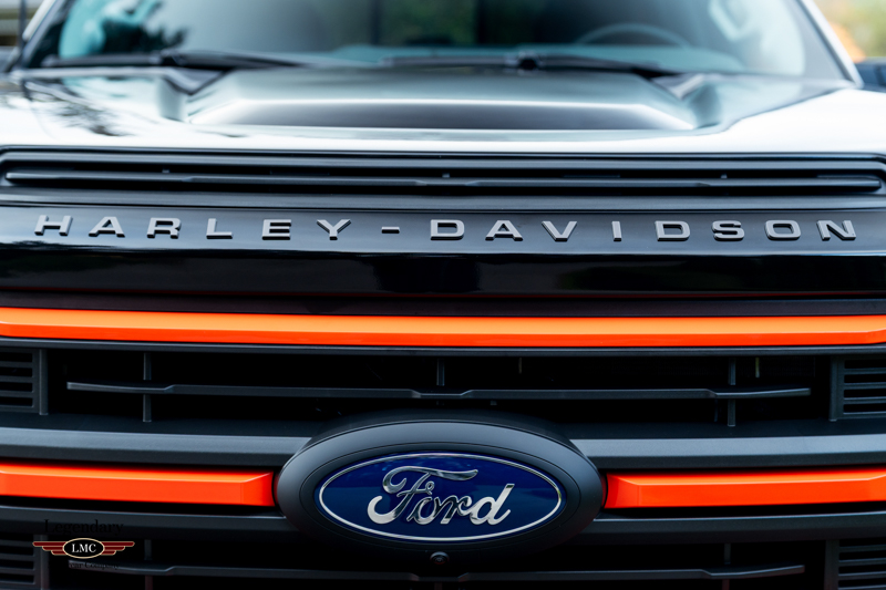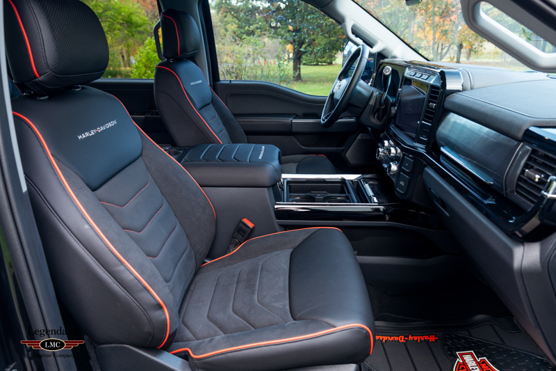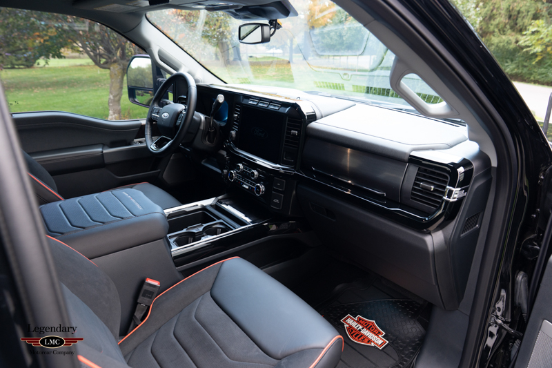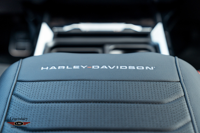 Inside, the cabin receives a full transformation with custom Harley-Davidson seat covers, a Piano Black accented console, and illuminated power running boards with rock-guard trim and entry lighting, blending utility with premium detail. Every element reflects the partnership between Ford and the legendary motorcycle marque Harley-Davidson—delivering a truck that is both highly capable and instantly recognizable.